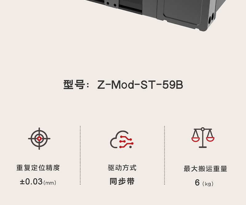 2022年9月23日 Lu, DongWu 智能電缸 0 Z-Mod-ST-59B 首頁 / 智能電缸 / Z-Mod-ST-59B 最高速度:水平:370mm/s(1.5kg負載),垂直:300mm/s(1.5kg負載)最大可搬重量 水平/壁掛: 6kg垂直: 4kg額定推力:100N(水平)重復定位精度:±0.03mm 下載3D模型 下載產品手冊 最高速度:水平:370mm/s(1.5kg負載),垂直:300mm/s(1.5kg負載)最大可搬重量 水平/壁掛: 6kg垂直: 4kg額定推力:100N(水平)重復定位精度:±0.03mm 下載3D模型 下載產品手冊 產品描述 資料下載 產品描述 Z-Mod-ST-59B 核心參數 54mm 100N (水平) 導程 額定推力 100~800mm 6KG 行程范圍 有效負載 *線框尺寸圖 規格參數 型號性能 電機功率/電壓 HL57CM23 (對標雷賽57CM23) 額定扭矩( N.m ) 參考曲線性能圖 導程(mm) 54 最高速度(mm/sec) 水平:370(1.5kg?負載) 垂直:300(1.5kg 負載) 額定加速 / / 最大可搬重量(水平/壁掛)(kg) 6 垂直 4 額定推力(N) 100 (水平) 行程范圍 100-800 ( 100 間隔) 馬達額定轉速(RPM) 參考曲線性能圖 注: 1G=9800mm/sec2,最高速度只做參考,負載與速度成反比 通用規格 重復定位精度 ±0.03mm 驅動方式 同步帶(進口鋼絲聚氨酯) 動態容許力矩(注1) Ma:100N.m, Mb:100N.m, Mc:130N.m 負荷允許伸出長度 200mm 傳感器 / 感應器線纜長度 1.5m 基座材質 擠壓鋁型材,黑色光澤 安裝面積精度要求 平面度0.05mm以下 使用環境 0-40℃, 85%RH(無結霜) 注1:行走壽命為10000km時的數值 尺寸圖代號說明 ? 質量; 單位:mm 有效行程 100 200 300 400 500 600 700 800 A 280 380 480 580 680 780 880 980 C 100 200 300 400 500 600 700 800 ?M 2 4 5 7 8 10 11 13 N 6 ?10 12 16 18 22 24 28 ?質量(kg) 2.4 2.76 3.12 3.48 3.84 4.2 4.56 4.92 資料下載 點擊下載產品手冊 點擊下載3D圖 點擊下載運動范圍圖 Z-Mod-ST-54B 核心參數 產品詳細參數 步進電機規格型號HL42CM06(對標雷賽42CM06)額定扭矩(N·m)參考曲線性能圖導程(mm)54最高速度(mm/sec)水平:300(1.5kg負載)垂直:220(1.5kg負載)額定加速度 (mm/sec2)//最大可搬重量 水平/壁掛(kg)4垂直1.5額定推力(N)30(水平)行程范圍(mm)100-500(100間隔)馬達額定轉速(RPM)參考曲線性能圖注:1G=9800mm/sec2 最高速度只做參考,負載與速度成反比。重復定位精度±0.03mm驅動方式同步帶(進口鋼絲聚氨酯)動態容許力矩(注1)Ma:34.7N·m,Mb:34.7N·m,Mc:55.6N·m負荷允許伸出長度120mm傳感器/感應器線纜長度1.5m基座材質擠壓鋁型材,黑色光澤安裝面積精度要求平面度0.05mm以下使用環境0-40°C, 85%RH](無結霜)注1:行走壽命為10000km時的數值 規格參數 型號性能 電機功率/電壓 HL42CM06 (對標雷賽42CM06) 額定扭矩( N.m ) 參考曲線性能圖 導程(mm) 54 最高速度(mm/sec) 水平:300(1.5kg?負載) 垂直:220(1.5kg 負載) 額定加速 / / 最大可搬重量(水平/壁掛)(kg) 4 垂直 1.5 額定推力(N) 30 (水平) 行程范圍 100-500 ( 100 間隔) 馬達額定轉速(RPM) 參考曲線性能圖 注: 1G=9800mm/sec2,最高速度只做參考,負載與速度成反比 通用規格 重復定位精度 ±0.03mm 驅動方式 同步帶(進口鋼絲聚氨酯) 動態容許力矩(注1) Ma:34.7N.m, Mb:34.7N.m, Mc:55.6N.m 負荷允許伸出長度 120mm 傳感器 / 感應器線纜長度 1.5m 基座材質 擠壓鋁型材,黑色光澤 安裝面積精度要求 平面度0.05mm以下 使用環境 0-40℃, 85%RH(無結霜) 注1:行走壽命為10000km時的數值 尺寸圖代號說明 ? 質量; 單位:mm 有效行程 100 200 300 400 500 A 251 351 451 551 651 C 100 200 300 400 500 ?M 2 4 5 7 8 N 6 ?10 12 16 18 ?質量(kg) 1.6 1.9 2.2 2.5 2.8 產品詳情 相關產品